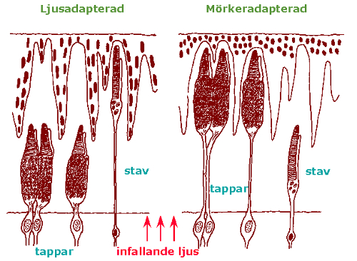 The cichlid retina shows the layered characteristics of the vertebrate retina with a pigment-epithelial cell-layer on the outside (sclerad) covering the photoreceptors (rods and cones). The photoreceptors are connected via various complex networks of intermediate neurons (horizontal-, bipolar- and amacrine cells) to the most vitread positioned ganglion cell layer. All separate ganglion cells axons are collected in the optic nerve. Generated by the environmental light conditions the rod- and cone photoreceptors can change position through migrating movements together with the melanin particles in the pigment-epithelial cells (retinomotor response; Ali, 1975).