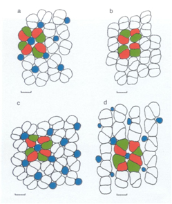 Rods and cones differ by their photopigment membranes. The photopigments in rods and cones are a mixture of rhodopsins and porphyropsins. The cichlid cones hold three different kind of porphyropsins which enables the fish to distinguish colours (Bowmaker, 1995). The cones are also arranged according to a regular mosaic of four double cones surrounding a central single cone. The two members of double cones hold alternate red- and green sensitive photopigments and the single cones hold a blue sensitive photopigment. Probably depending on the environmental light conditions, the single cones may be partly or entirely absent. In the latter case the double cones form a row pattern (Van der Meer et al., 1995).