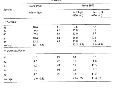 Innate behavioural studies on these two species revealed a significantly lower photopic threshold in H. pyrrhocephalus in red light (656 nm), whereas no significant different threshold in blue light (436 nm) could be registered between H. pyrrhocephalus and H. argens (Smit & Anker, 1997).This correlates well with their resembling SWS cones and their differing MWS and LWS cones but it was not expected on basis of their cone mosaics. According to Nuboer (1986), the single cones may not contribute to photopic sensitivity. That the photopic threshold entirely depends on the double cones, supports the idea that the principle function of the double cones is luminosity detection rather than colour vision.