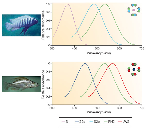 Trichromacy and tetrachromacy are common in fish (Neumeyer, 1991), the spectral range extending in cyprinids and salmonids from less than 350 nm to around 800 nm (Bowmaker, 1991). Cichlids are primarily trichromats (Bowmaker, 1990) although they may lose their short-wave sensitivity when migrating to deeper waters (Van der Meer, et al., 1995).