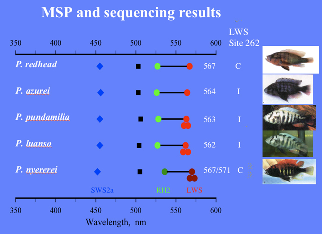 Colour vision has also been shown to help in mate choice and, on the long run, to conduce to sympatric speciation. Male specimens of H. nyererei showed inherited colouration differences with the sympatric colour morphs “red” and “zebra”, whereas the less conspicuous females favoured males of their own colour morph (Seehausen, 1997; Seehausen & Van Alphen, 1998). The clear preference of a female to mate with a male from their own morph may be related to differences in their spectral sensitivities. Microspectrophotometry revealed a slight difference in the lmax of the LWS members of the double cones among these colour morphs that coincided with the related opsin gene sequence differences and male nuptial colour (Carleton, et al., 2005). Moreover, (innate) behavioural studies showed a difference in spectral sensitivity thresholds: in blue light, the females of the blue morph (Pundamilia pundamilia) performed significantly better than the females of the red morph (P. nyererei) and in red light the pattern was reversed. In other words, P. pundamila females responded to lower intensities of blue light than did P nyererei females and, controversely, P. nyererei females responded to lower intensities of red light than did P. pundamilia females (Maan et al., 2006).