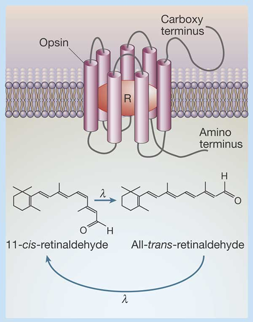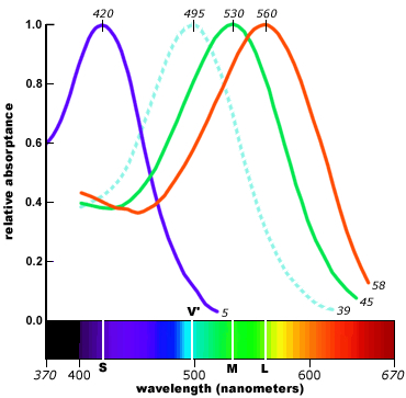 The simultaneously operating photoreceptors are usually cones and the maximum absorption spectra of the photopigments are numerous (e.g. Terai, et al., 2002; Parry et al., 2005). The spectral sensitivity of the photopigments is primarily determined by the amino acid sequence of the opsin protein and, to a lesser extend, by the type of chromophore (Hárosi, 1994; Yokoyama, 1995).