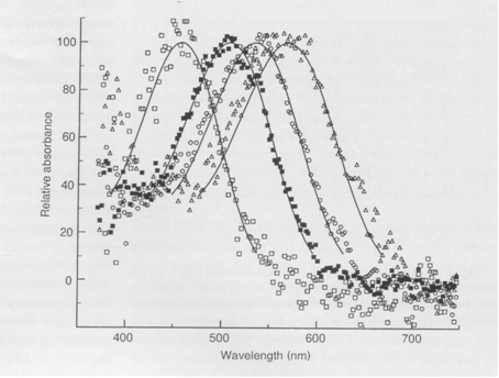 A standardized computer program was employed to estimate the wavelength of maximum absorbance (l-max) of each outer segment. First the two spectra of a cell were averaged and then the absorbance values at pairs of adjacent wavelengths were averaged to obtain a mean curve from the outward and return records. Each of the twenty absorbance values on the long wavelength limb of the curve (corresponding to a 40 nm segment and to absorbances in the range of approximately 45-90% of the maximum of the cell) was then referred to a standard template curve in order to obtain an estimate of l-max. This operation amounts to finding the spectral location of a standard curve that gives the percent absorbance value under consideration. A second estimate of lmax was obtained from the top of the absorbance curve by fitting each of 50 consecutive absorbance points, centred on the highest point, to the template curve and averaging the resulting estimates (for the rationale behind this methodology, see Mollon et al., 1984).