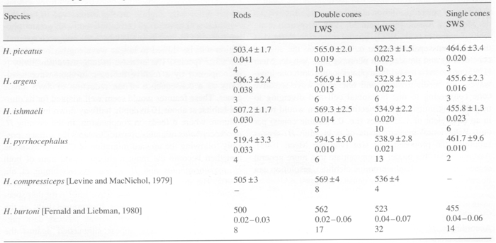 MSP showed that in all studied species the double cones were non-identical with LWS and MWS members, just as previous studies on haplochromines had revealed, whereas the single cones were al SWS. The visual pigments of H. ishmaeli and H. argens appeared to be spectrally identical and similar to those of H. compressiceps (Levine & MacNichol, 1979), with the double cones containing pigments with lmax at about 568 nm and 534 nm, the single cones having a lmax at about 456 nm and the rods with a lmax at about 506 nm. The band widths of the absorbance spectra suggest that these pigments were probably mixtures of rhodopsines and porphyropsins. The lmax of the photoreceptors of H. piceatus were similar to those of H. argens and H. ishmaeli though the MWS component of the double cones had a lmax at about 522 nm (also found in H. burtoni; Fernald & Liebman, 1980), somewhat shorter than that of the other two species. The pigments in H. piceatus were best fitted by a pure rhodopsine template. In contrast, H. pyrrhocephalus was distinctly different with its double cones and rods shifted to significantly longer wavelengths. The double cones had lmax at about 595 nm and 539 nm and the rods a maximum at about 519 nm. Only the lmax of the SWS cones was not displaced from the other species. The long-wave displacement of the double cones and rods was probably primarily a consequence of a higher proportrion of porphyropsins in the rhodopsing/porphyropsin mixtures. Similar variations in lmax have been reported for extracts of visual pigments from cichlids of Lake Malawi (Muntz, 1975).