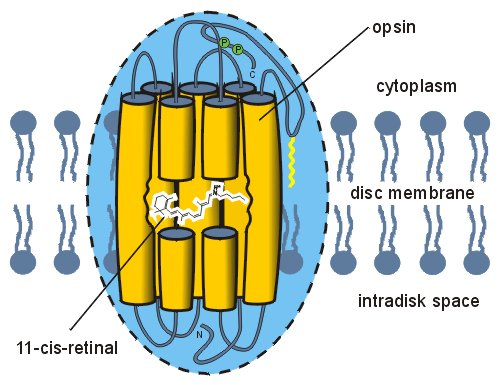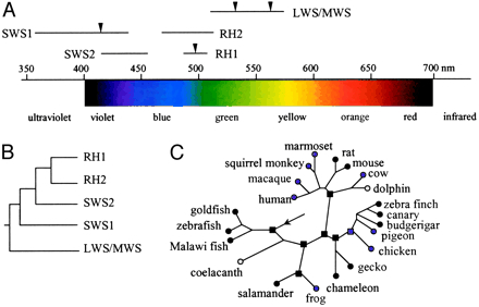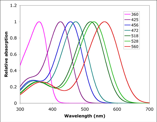 Half a billion years of vertebrate evolution have produced only a few spectrally distinct classes of cone pigment encoded by distinct opsin genes (Bowmaker & Hunt, 2006) with absorption maxima varying between 350 nm and 570 nm. This suggests that the existing photopigments are most successful. They are composed of a protein moiety, opsin, linked to a chromophore, retinol, a derivative of vitamin A. The spectral sensitivity class of the pigment is determined primarily by the interactions of retinol with specific amino acids in the protein. Invertebrate visual pigments are basically constructed in a similar way and only differ slightly in detail from the vertebrate ones (Nakagawa et al., 1999).