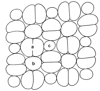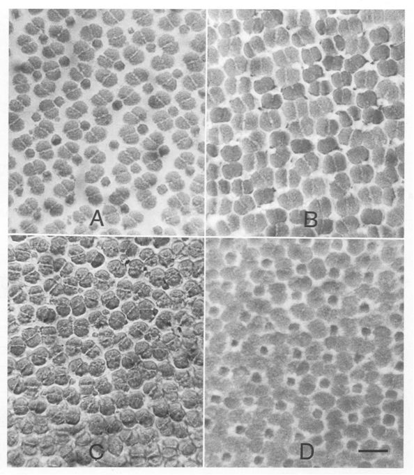 Light projected on the retina could easily be scattered from one cone to its neighbours. At the level of the outer segments the reduced contrast would negatively effect the resolution. The cones, especially their outer segments, should be separated by means of a light-absorbing substance (melanin pigment within the protrusions of the pigment epithelial cells penetrating between the cones). Intercellular space is also necessary for metabolic reasons (Müller-fibres). Last but not least, the opposed migrating movements of rods and cones require separation of the cells while some space between the cone remains necessarily occupied by the rod myoids (especially in the larger eyes of adults since new rods are generated throughout life between the other retinal neurons; Johns & Fernald, 1981). Since separate oblong cells are likely to have curved shapes (in cross-section), their sections in the plane of the receptor field are assumed to be basically circular. The minimal space between touching circles is regarded to provide sufficient intercellular space.