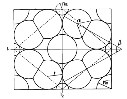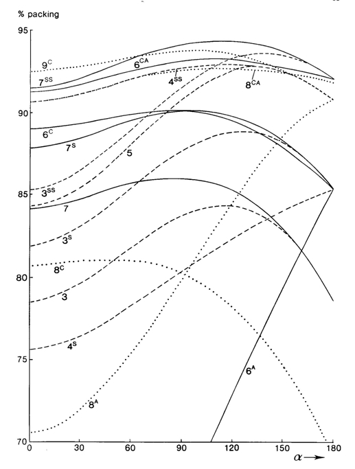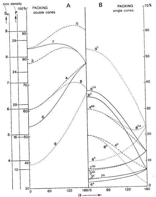 Computations show that a double cone with alpha = 115 degrees provide the best possible packing of 84%. In comparison, a row arrangement of single cones (alpha = 0 degrees or 180 degrees) provides a packing of 78,5%. A triangular arrangement of single cones could provide a better packing (91%), but this arrangement does not meet a number of demands set by the model.