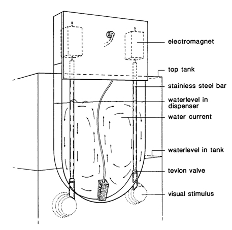 The dispenser was positioned inside the tank at the far end of the cylindrical compartments, with short outlets (4 cm) to both potential patches. A uniform suspension of prey was realized by means of a constant water circulation generated by an aerating stone. The specific shape of the dispenser reduced turbulences and prevented accumulation of food-items. The valves were of a similar construction as in the dispenser described by Northmore (1968). A tevlon ball at the lower end of a stainless steel bar suspending from an electromagnet rested in a tevlon seating thus shutting off the 6 mm diameter drain hole by the weight of the bar. On a pulse of current the electromagnet elevates the bar, allowing a few ml of suspension to flow through the drain. The amounts of food items per delivery depends on the type of prey, the duration of the current pulse, the degree of elevation of the bar, the particle concentration and the difference between the level of the suspension and the water level in the tank. These variables were adjusted experimentally to fit the required number of food-items per delivery. Satisfying results were obtained with a current pulse duration of 0,1 s, elevation of the bar of 4 mm and the suspension level about 15 cm above tank-water level. A suspension of 150 Chaoborus larvae per litre provided a mean rate of 1,57 larvae per delivery (n = 100; sn-1=1,10). The electromagnets moving the valves communicated with the COS.