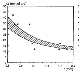 Visual acuity, expressed as the minimum separable angle (a) in minutes of arc improved from about 36 min. of arc in large juveniles (SL >3 cm; r = 0,65 mm) to 12 min. of arc in adults (r = 1,86). As the visual stimuli were always in front of the fish when made their decision to enter or not enter a cylindrical compartment, the image of the stimulus was projected on the back of the eye (caudal part of the retina). In this region the cone density is highest throughout ontogeny the anatomical resolution based on a visual unit of four double cones surrounding a single cone (Otten, 1981) coincides pretty well with these behavioural measurements.