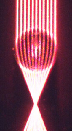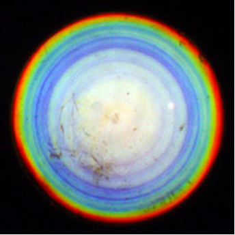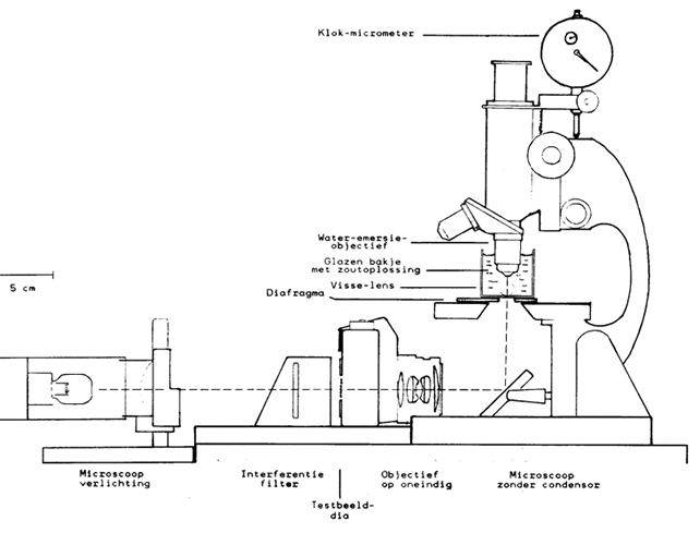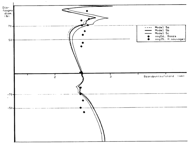 The centre and surround focal lengths were measured at red light (650 hm; no chromatic aberration) by means of a Schlieren test using an object glass with so-called ring-apertures (black paint; 0,6-3,0 mm) or a non-transparent plastic sheet with reducing-apertures (openings; 1-2 mm) underneath the glass container holding the lens. Ring- and reducing-apertures deviated less than 1% from true circles. Various ring-apertures were used to cover increasing areas up to 50% of the central part of the lens (r varying from 10% to 65% of the lens radius). Various reducing-apertures covered increasing areas up to 50% of the peripheral part of the lens (r varying from 66% – 100% of the lens radius). The mean value between the centre and surround focal lengths was taken as the average focal length (in red light). The relative spherical aberration for centre and surround light-beams was given as a percentage of this average focal length (the absolute spherical aberration is known as the difference in focal length between the centre and surround incoming light-beams).