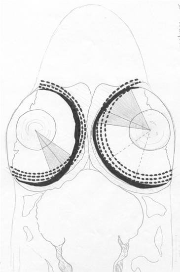 Although accommodation was not studied, its presumed performance has been described elsewhere (e.g. Fernald, 1990) and its potentials are worthwhile to speculate upon. The position of the lens in relation to the retina is, presumably, not fixed. Neither is it clear to what extend and in which direction the lens can move, although in most fish species the accommodative movement is carried out along a more or less horizontal axis (Fernald, 1990).