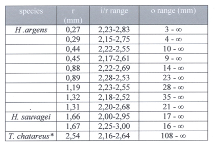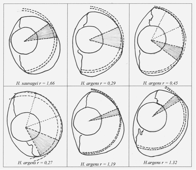 Although the eyes of H. argens were relatively larger than the eyes of H. sauvagei, no specific difference in shape could be established. The eye shape did not change with eye size.