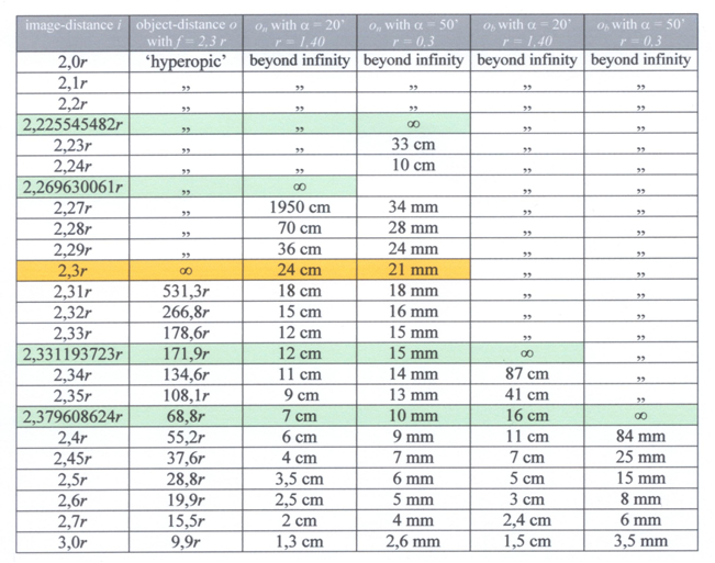 The application of depth of field on basis of various constraints of resolution (see below), provided segments of retinal areas with matching object distances varying from several centimetres to infinity. The depth of field from nearby to infinity was much enlarged with increasing constraint of resolution while it varied in a similar proportion as eye size. Accordingly, the retinal area providing the best possible image (a = 50’) was defined between in = 2,465r and ib = 2,226r in juveniles (r = 0,3 mm) with a depth of field from 1 cm to infinity. In adults (r = 1,4 mm) the best possible image (a = 20’) was defined between in = 2,363r and ib = 2,27r with a depth of field from 7 cm to infinity.