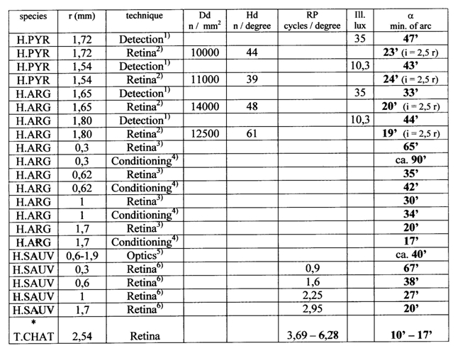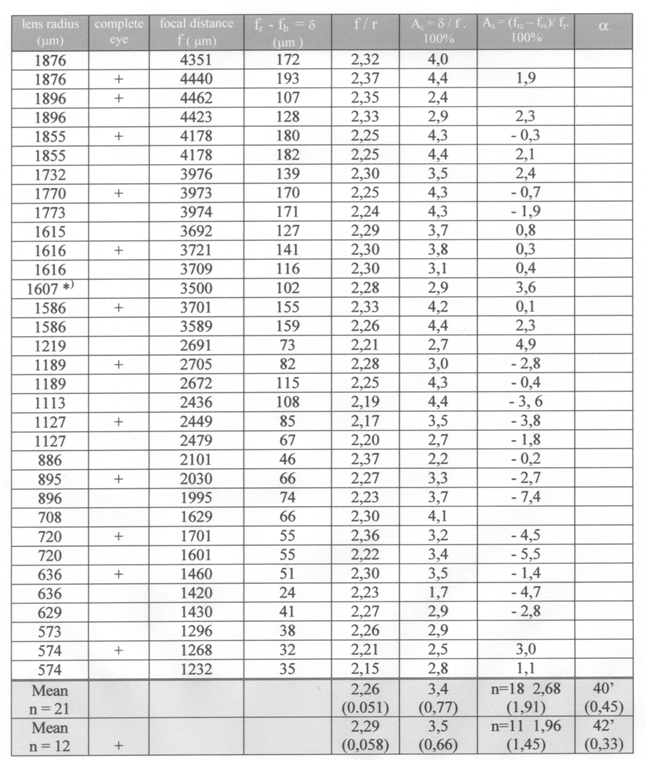 The measurements were carried out with red or blue light using interference filters (650 and 436 hm). The mean value between the two was used as the average focal length (at ca. 545 hm) and to calculate the ratio between the focal length and the lens radius (f/r). The relative chromatic aberration for red and blue light was given as a percentage deviation of the average focal length (the absolute chromatic aberration is known as the difference in focal length between the ends of the visual spectrum which is not similar in each organism).