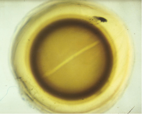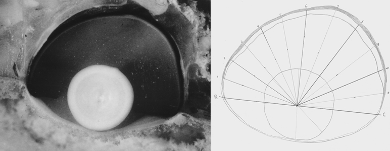 All fishes were anaesthetized with an overdose of MS222 (1g/l) before they were measured (SL) and both their eyes were isolated. Lenses were separated from the left eyes (which were used for further retinal investigations) and of the right eyes the sclerae were carefully removed. All measurements were carried out in a solution of 0.75% NaCl. A thick PVC sheet with circular wholes (3-6 mm) was placed at the bottom of the glass container holding the solution in order to fix the lens or the entire eye. The bottom of the glass container was very thin (microscope covering glass) to reduce optical influence to a minimum. Lens diameters were measured in four directions using a Nikon projection microscope (20 x). Halving the mean value provided the lens radius (r).
