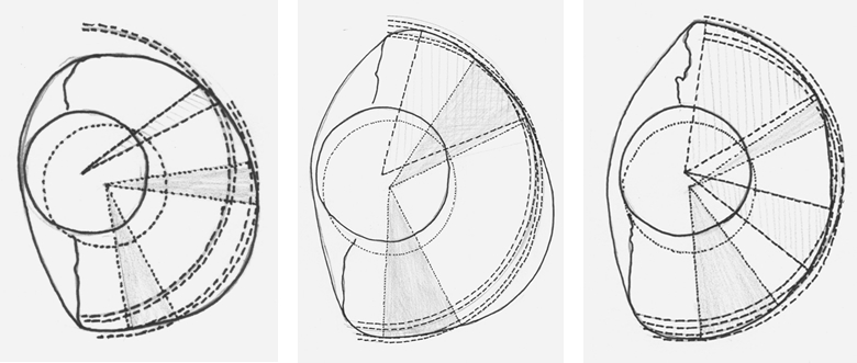 The eye-cups were not circular: the sections were slightly elongated and the caudal area was more or less flattened and more strongly curved towards the medial part of the cup. Consequently, the image-distance was never the same in every direction irrespective of the position of the eye-lens. Moreover, the position of the lens was different, even in the two eyes of one specimen. The range of the image distance per eye was therefore preferred over the mean values. In all cases the range of the image distance varied from lower to higher values around the connected focal length. In general, the largest image distances were located in the caudal areas. The position of the image distance equal to the focal length was on most occasions in the rostral area.