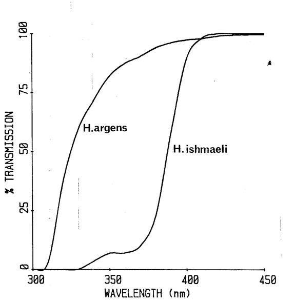 Otten (1981) proposed a correction of the chromatic aberration in the perch by the colour filtering of its yellow cornea. If a smaller range of the chromatic spectrum would admit a larger chromatic aberration of the eye lens, one could use the same argument for the reverse: if the chromatic aberration is clearly smaller (as found in H. elegans and H. burtoni) this may be so because the spectral transparency of the lens is broader, e.g. include the UV. Proteins of the optical media like cornea, lens or vitread body have indeed the ability to absorb or transmit in the invisible shorter wavelengths (Losey et al., 1999) and they may differ even among closely related species like the Lake Victorian haplochromines (Andrea Thorpe, pers. comm.) and are functionally explained as improving visual performance through the reduction of chromatic aberration (Douglas & Marshall, 1999). Accordingly, one should expect the high definition lenses of H. elegans and H. burtoni to compensate for the lack of UV absorbance by any of the ocular media, whereas the more severe chromatic aberration in other species could be reduced by UV filtering of the cornea or vitread body. A combined investigation of the chromatic aberration of the lens and the absorbance / transmittance of UV by the optical media may solve the problem.