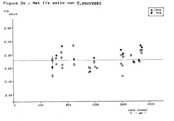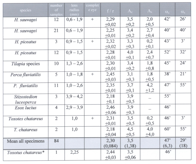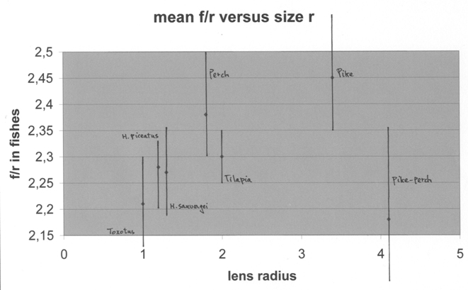 The ratio f/r in H. sauvagei was size independent and rather constant with a mean value of 2,27. There was no clear difference in separate lenses and complete eyes. The f/r ratio in the other cichlids demonstrated a similar constancy with a similar mean value. The f/r ratio in the remaining fishes showed more intra-specific variation than it did in the cichlids. Higher mean values were found in perch and in pike, which may benefit the frontal vision on far-away prey in these ambush hunters. Lower mean values were found in pike-perch and in the archerfish. The mean values of the f/r ratio were slightly higher in complete eyes compared to the separate lenses within the same species measured. This is possibly due to small injuries in isolated lenses.
