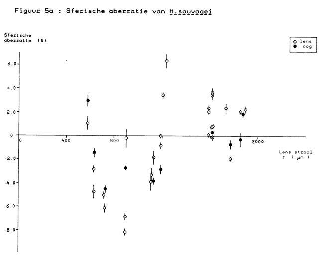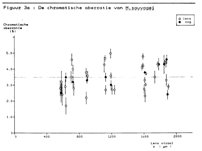 The chromatic aberration was independent of eye-size and about the same in all species (ca. 4%). It is obviously the limiting factor with regard to lens quality. Similar values were found in other species, like trout (4,5%, Scroczynski, 1976), rudd, (4,6%, Scholes, 1976), rock bass (4,1%, Sivak & Bobier, 1978) and perch (4,5% Scroczynski, 1979; Otten, 1981). Otten (1981) found a much lower value of 2% in H. elegans just as Fernald & Wright (1985) found in H. burtoni. The deviation of these values from the chromatic aberration found in other haplochromine cichlids as mentioned in this paper is not understood, especially since Otten used the same technique to measure the chromatic aberration in perch and found a similar value as mentioned in this paper. A major difference between these closely related haplochromines is that they originate from different lakes (where they were endemic): H. burtoni from Lake Malawi, H. elegans from Lake George and H. sauvagei and H. piceatus from Lake Victoria.
