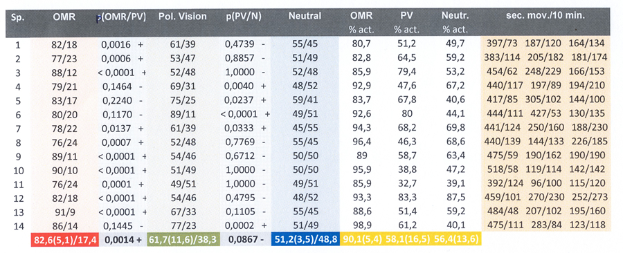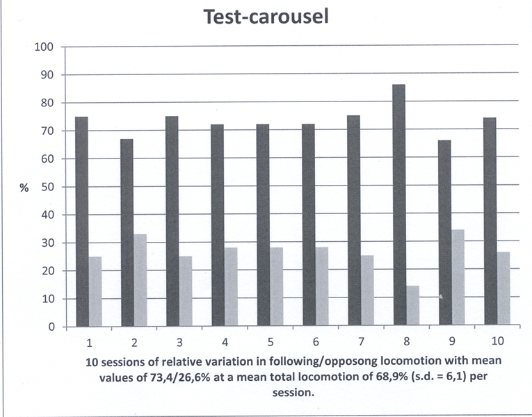 The fish did not always swim at a uniform rate and the specimens performed some individual variations that were considered to be irrelevant for the purpose of this study, i.e. whether the species was capable to discriminate between alternating e-vectors. In spite of discrepancies in a number of specimens, statistical analysis did not reveal a significant difference between the mean response to the Test-carousel and Control 2 (p=0,0867) whereas a significant difference existed between Control 1 (OMR) and the Test-carousel (p=0,0012). The mean fraction following locomotion in the Test-carousel (with respect to all locomotion) amounted 61,7% (s.d.=11,6) and the mean positive response to Control 2 was 51,2% (sd=3,5).