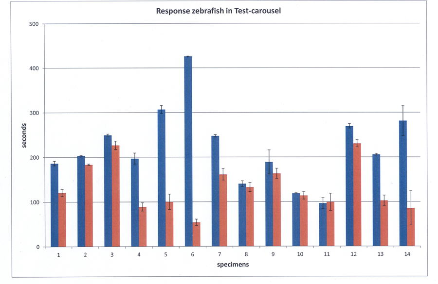 When exposed to the rotating blank, the fish were much quieter with a 45% swimming movement in the same direction of the rotation, again obtained from 10 measurements with a duration of 600 seconds each. Only in one out of ten sessions there was no significant difference between the Test-carousel and Control 2 (p=0,4615). The largest deviation from a 50/50 result during one session (being 38/62) was still not statistically significant (p=0.1169). The mean difference in swimming movements with the test carousel compared to Control 2 was highly significant (p<0.0001).