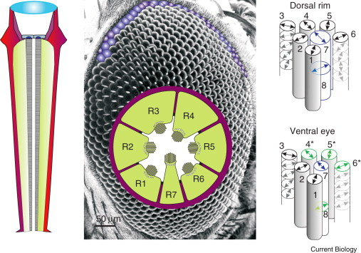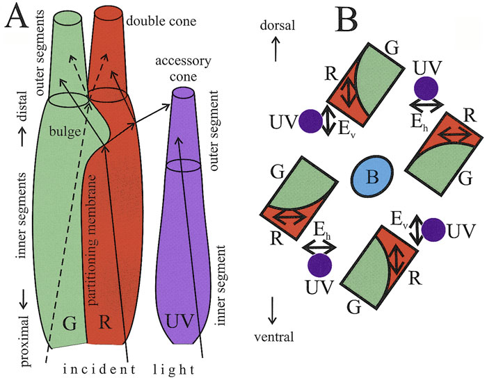 There were no reports on structural differences in the retinas of adult zebrafish, although the cone photoreceptor mosaic appeared to change during ontogeny with respect to the cone subtype ratios and the precise row arrangement (Allison et al., 2010). It is possible that a more or less parallel positioning of double cones in the precise row arrangement provides enough intraspecific variation to discriminate between alternating e-vectors or not, depending on the average angle between neighbouring double cones in a row. Together with neighbouring UV-sensitive cones, this might provide a mechanism for PV (Novales Flamarique et al., 1998).
