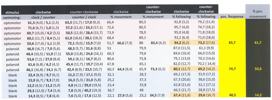 OMR could be instantly viewed in a qualitative way. However, for the purpose of a generalized quantification, more intensive measurements were carried out. The swimming direction could be generated by the rotating direction of the stimuli, without being a question of OMR, since the healthy fish were accurately equipped to perceive movement. However, when the swimming direction was evoked by OMR it clearly dominated the fish swimming behaviour.