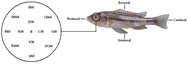 The zooplanktivore H. tanaos follows a saltatory search strategy andspirals towards its prey while it seems to refocus at intervals. So, the medial dorso-caudal region of its retina may serve in the detection of food particles. The lesser resolution in this region in the new population may indicate an increased difficulty in the detection of small prey which coincides with the findings of Van Oijen and Witte (1996).