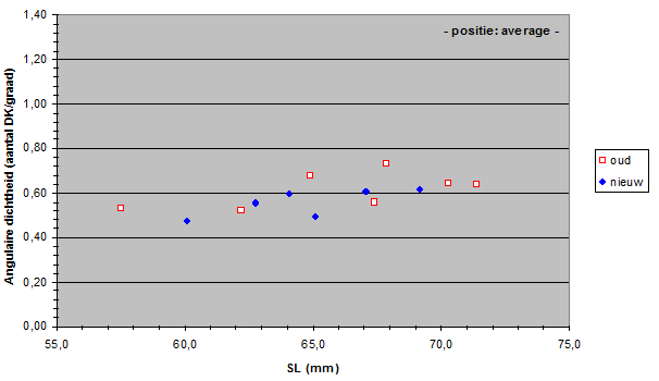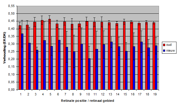 The size of the double cones (Sd) in the old population varied from 12,94 to 46,95 mm2  and Sd in the new population varied from 16,64 to 49,51mm2. In the rostral region of the retina no significant difference in the size of the double cones could be established. However, a significant enlargement of the double cones was found in other parts of the retina of the new population, especially in the caudal region. In general, one can say that the double cones have become larger in the new population.