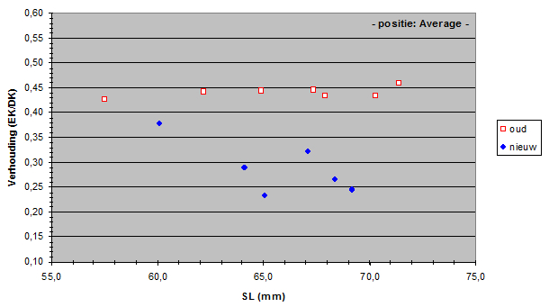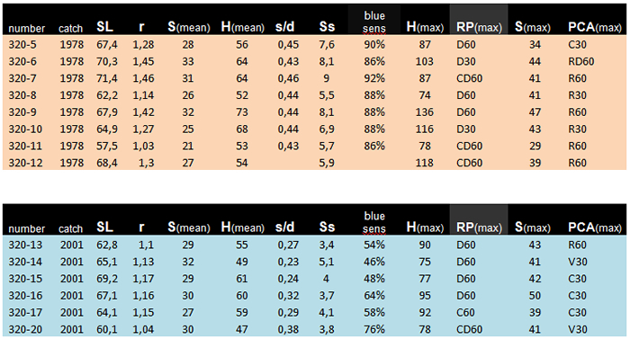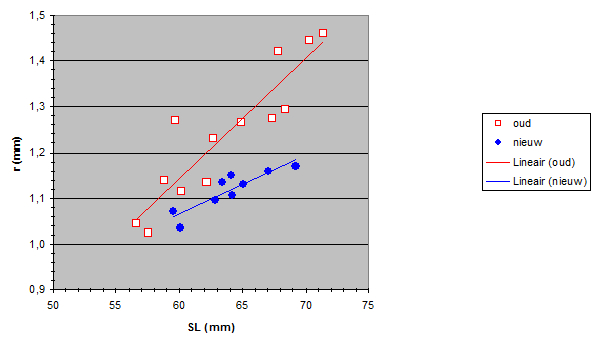The Standard Lengths (SL) of the old population varied from 56,5 to 71,4 mm and SL of the new population varied from 59,5 to 69,2 mm. The measured lens radius (r) was plotted against SL in both populations.