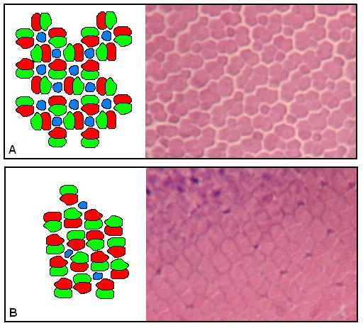 Young haplochromine cichlids develop retinas designed for trichromatic vision: a regular mosaic of  blue sensitive single cones surrounded by four unidentical red/green sensitive double cones, also called a square pattern (Otten, 1981, van der Meer, 1992). New cones are formed by cell division along the periphery of the retina (Powers & Raymond, 1990). During the life-long growth of the eyes, the square pattern may remain unaltered (Fernald, 1985). However, in many of the haplochromines, the single cones diminish or disappear completely in some retinal areas whereas the double cones reorient and become enlarged, thus increasing their photon catching ability (van der Meer et al. 1995). Within some species the potency to adapt to an ambient red shift may be stronger than in others.